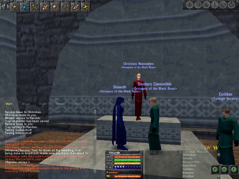 Finally the big day arrives. Randon stands in for Gregor Bell to walk Sinaedh down the aisle, marking her transition from one life to another. Christiana Ravenshire, friend of the couple and Bishop of the Church officiates the ceremony. |